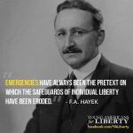Friedrich Hayek QuotepicThis entry was posted in Images and tagged Friedrich Hayek Individual Liberty Political Theory Quotepic Friedrich Hayek Quotepic: “‘Emergencies’ have always been the pretext on which the safeguards of individual liberty have been eroded.” Related posts: Thomas Jefferson on Liberty Friedrich Hayek on Individual Liberty George Mason On Self-Ownership